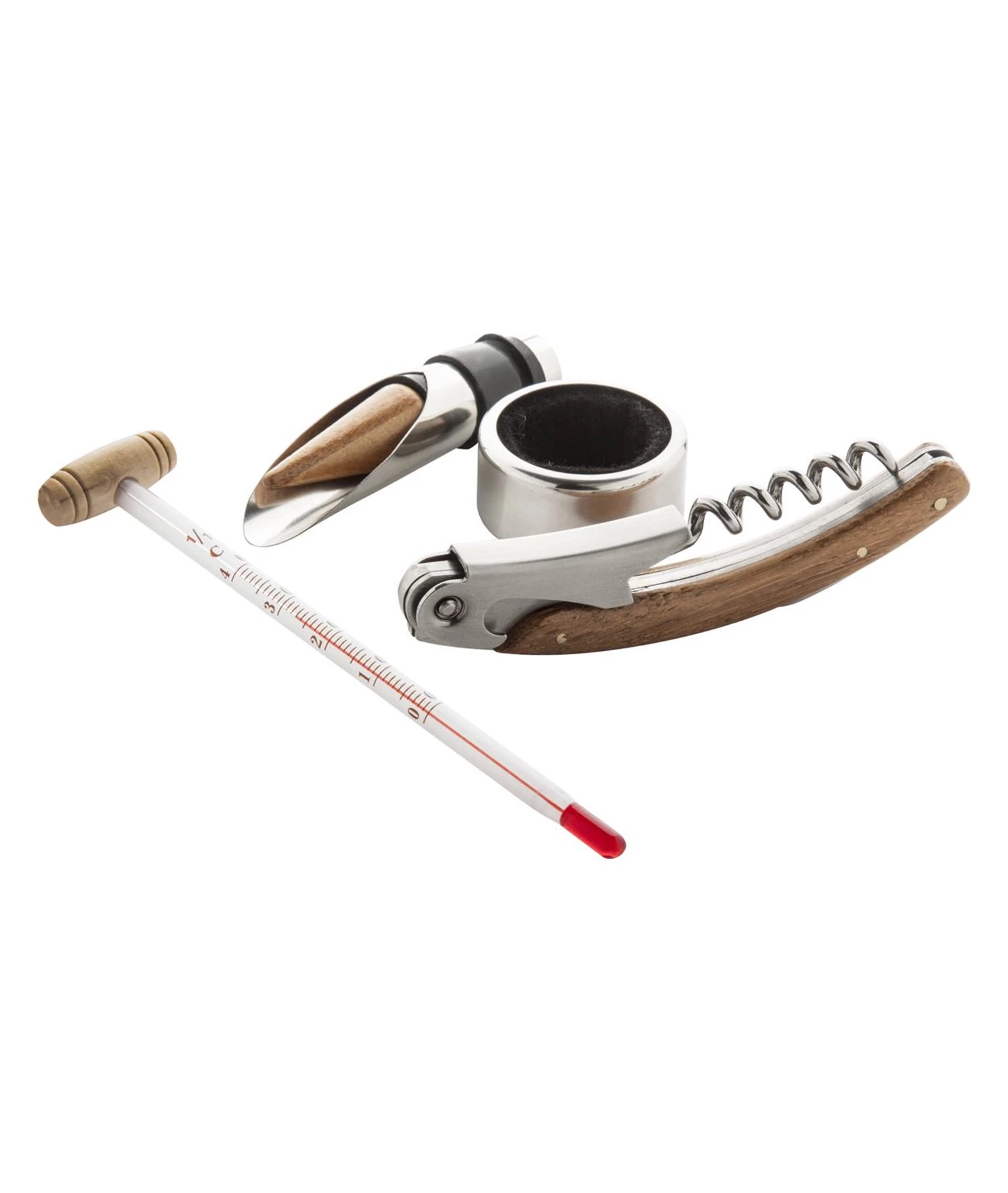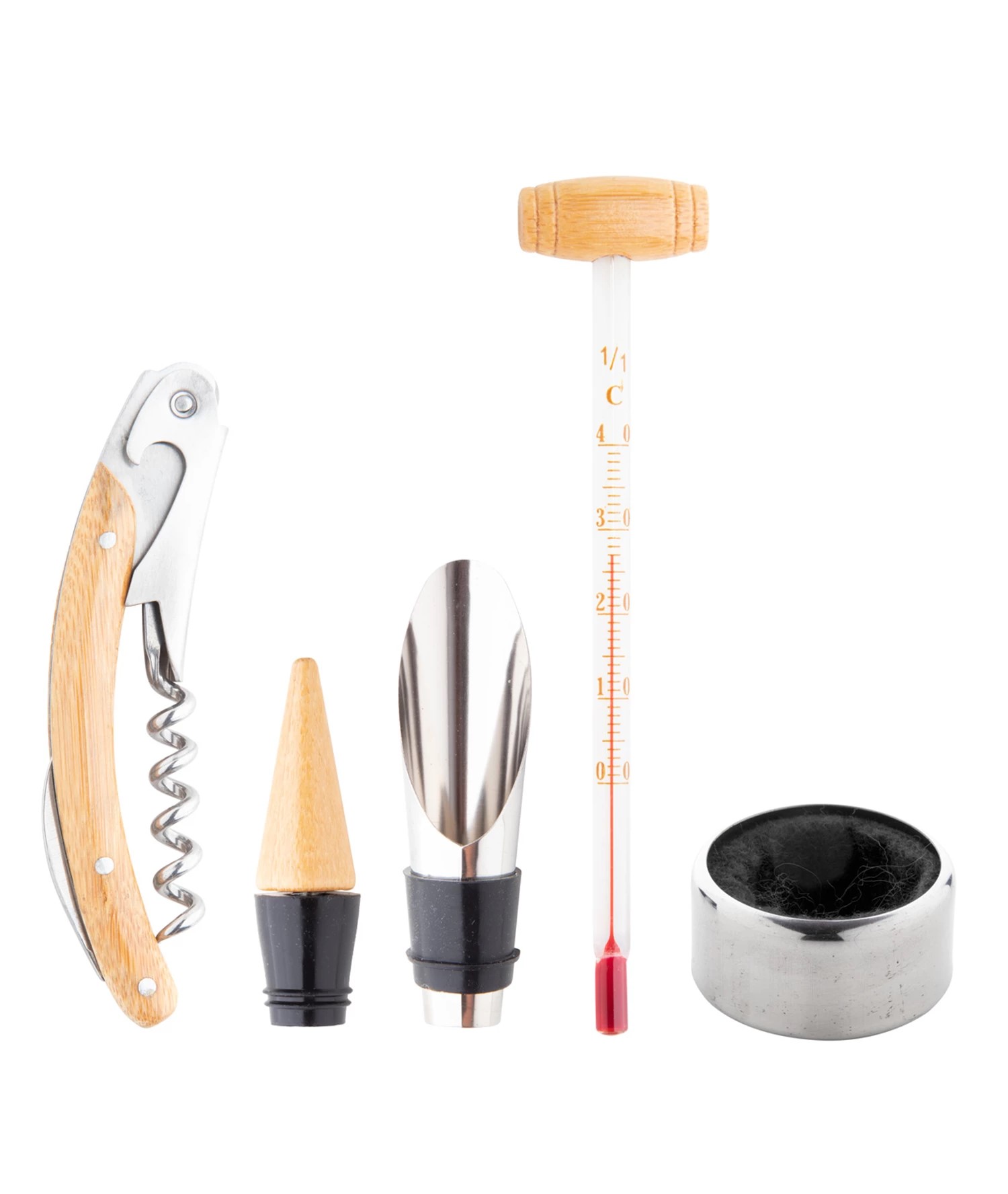 4-djelni set za vino,od čelika i bambusa. u Bambus kutiji. Dimenzija : 147x168x49 mm.